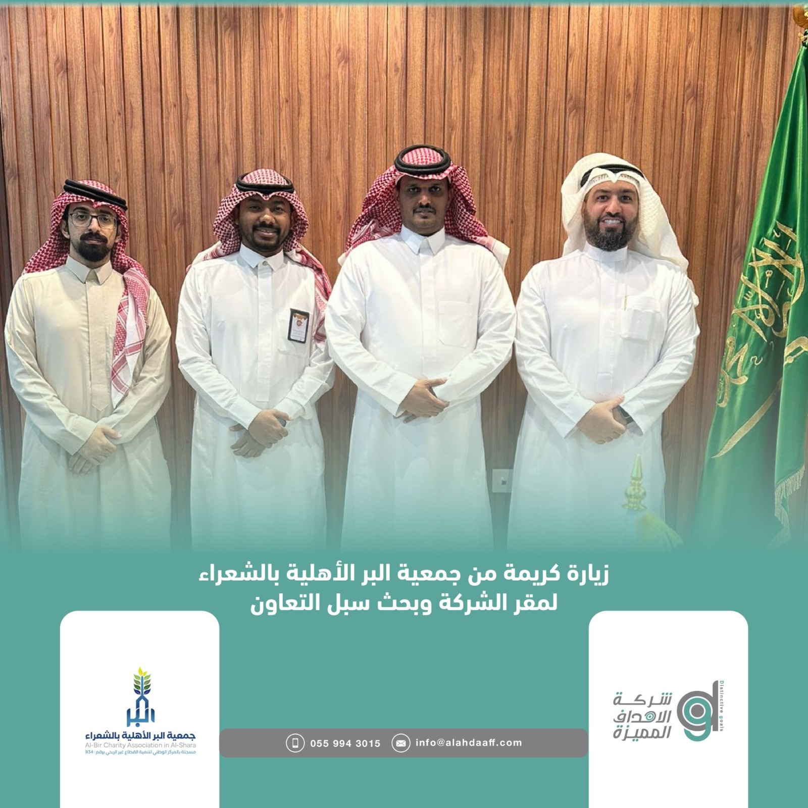 تشرفنا في شركة الأهداف المميزة بزيارة جمعية البر الأهلية بالشعراء حيث جرى بحث فرص التعاون المشترك بما يخدم العمل الخيري والمجتمعي